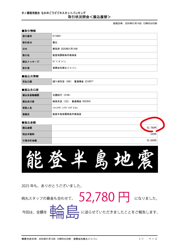 スタッフの分と合わせて 52,780円、輪島市のほうに送らせていただきました。